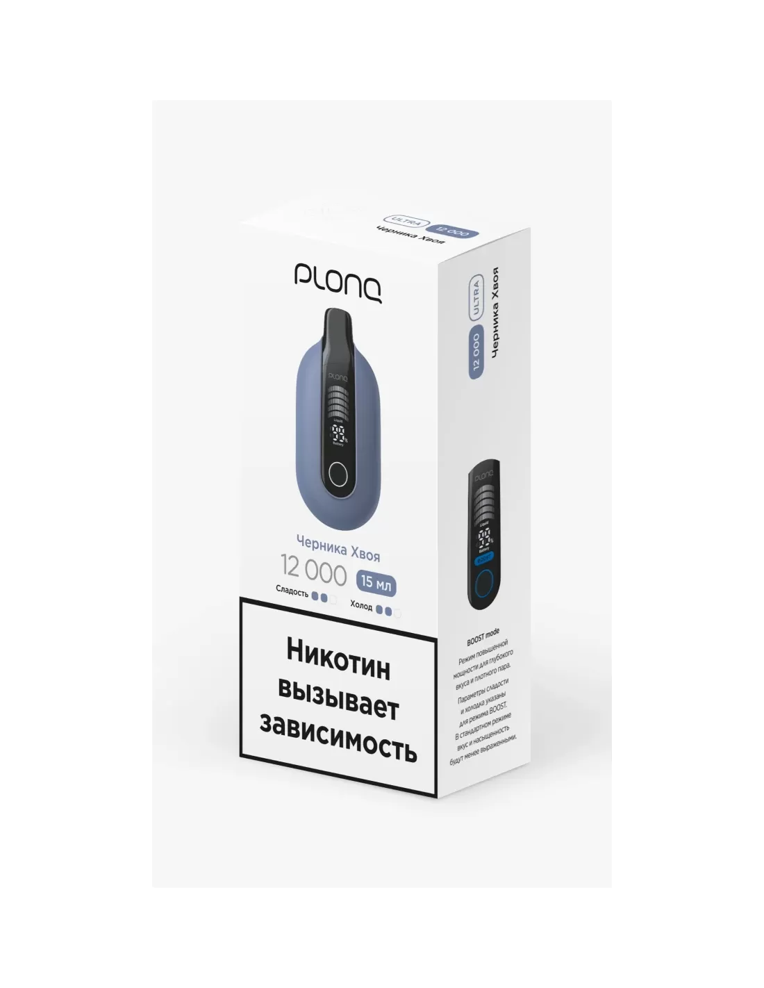 Характеристики: 12 000 затяжек; вкус — черника с лёгкой хвоей; аккумулятор — 650 мА·ч с возможностью подзарядки.